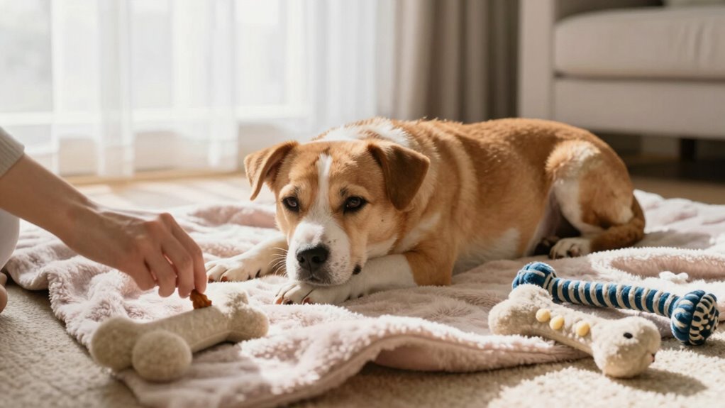 Um Ihren ängstlichen Hund ruhig und glücklich zu halten, versuchen Sie sanfte Massagen oder Streicheleinheiten mit langsamen, gleichmäßigen Bewegungen und leiser Stimme. Verwenden Sie beruhigende Klänge wie sanfte Musik oder weißen Rauschen, und schaffen Sie eine friedliche Umgebung mit entspannenden Düften wie Lavendel. Bringen Sie Ihrem Hund beruhigende Signale wie „ruhig“ bei und belohnen Sie ihn für entspanntes Verhalten. Integrieren Sie duftbasierte Hilfsmittel und angenehme, stressarme Aktivitäten wie Puzzle-Futterautomaten. Halten Sie die Situationen friedlich, und Sie werden noch weitere Wege entdecken, um Ihren Hund zu beruhigen, während Sie weiter erkunden.