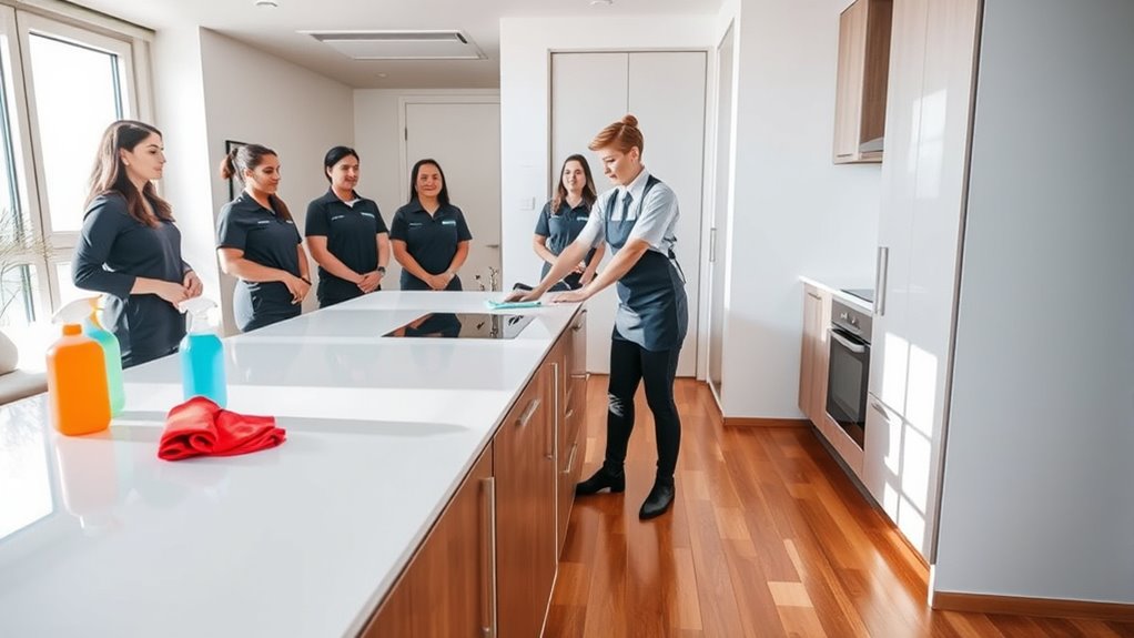 Um Probleme bei der Reinigung in der Apartment-Stop zu vermeiden, benötigen Sie konsequentes Schulungstraining, das klare Standards festlegt und visuelle Hilfsmittel wie Checklisten und Diagramme verwendet. Regelmäßige praktische Übungen, Auffrischungskurse und offene Kommunikation helfen dem Personal, mit den Verfahren auf dem Laufenden zu bleiben. Das Erkennen von Erfolgen motiviert die Teammitglieder, hohe Standards aufrechtzuerhalten. Der Einsatz von Technologie und fortlaufendes Feedback unterstützen ebenfalls die Einheitlichkeit. Wenn Sie mehr Möglichkeiten entdecken möchten, um sicherzustellen, dass dieser Prozess effektiv bleibt, gibt es noch mehr zu erkunden.
