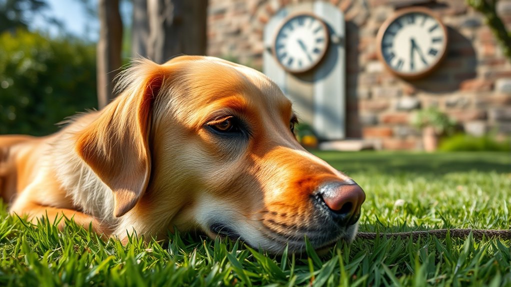 Da die *biologischen Uhren* von Hunden mehr beeinflussen als nur den Schlaf, helfen sie auch bei der Regulierung von Hunger und *Fütterungsroutinen*. Wenn *Fütterungszeit naht*, bemerken Sie vielleicht, dass Ihr Hund verspielter oder aufmerksamer wird, was darauf hindeutet, dass das Futter bald kommt. Sein natürlicher Rhythmus steuert diese Signale und lässt ihn die regelmäßigen Fütterungszeiten erwarten. Sie können auch Veränderungen im *Bellen* beobachten; Ihr Hund könnte je nach Hunger oder Routinen mehr oder weniger bellen. Dieses *Verhalten ist nicht zufällig*, sondern mit seiner inneren Uhr verbunden, die sich an den täglichen Zeitplan anpasst. Das Erkennen dieser Zeichen hilft Ihnen, zu verstehen, wann Ihr Hund hungrig ist oder einfach nur Aufmerksamkeit sucht. Zusätzlich stärkt die konsequente Einhaltung der *Fütterungsroutinen* seinen biologischen Rhythmen und macht die Mahlzeiten vorhersehbar und für beide weniger stressig. Das Etablieren von Routinenkonsistenz kann Ihre Fähigkeit verbessern, die Bedürfnisse Ihres Hundes vorherzusehen. Das Verständnis seiner inneren Uhren kann Ihre Fähigkeit, die Bedürfnisse Ihres Hundes vorherzusehen, zusätzlich verbessern. Außerdem kann das Verständnis, wie seine zirkadianen Rhythmen funktionieren, dazu beitragen, Fütterungs- und Aktivitätspläne für ein besseres Wohlbefinden zu optimieren.
