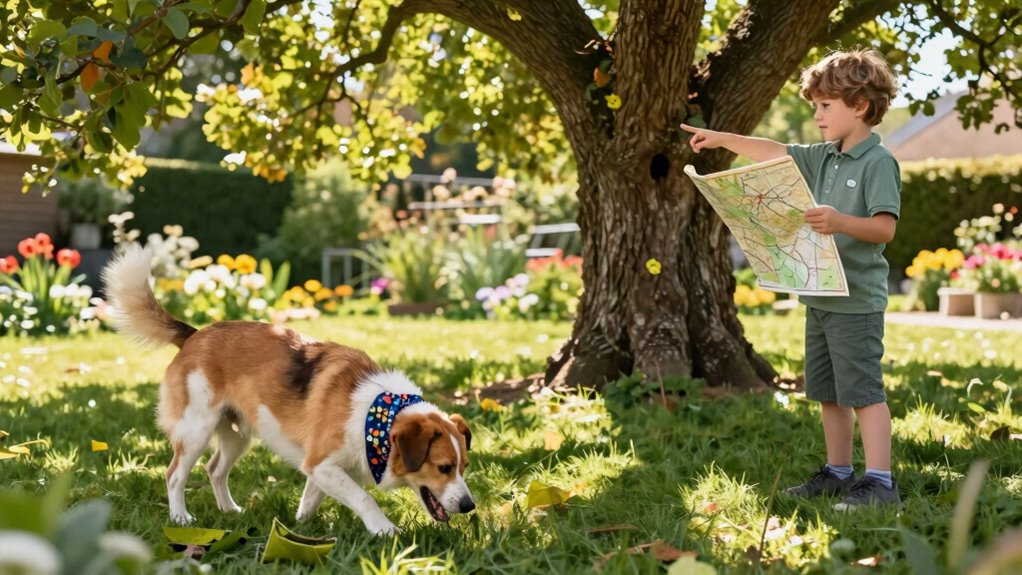 Um eine Schatzsuche mit deinem Hund zu starten, trainiere ihn zuerst mit Grundkommandos wie „Sitz“, „Platz“ und „Komm“, um Kontrolle und Sicherheit zu gewährleisten. Wähle einen vertrauten, gefahrlosen Ort und halte die Umgebung ruhig, indem du Leckerlis oder Spielzeug zur Motivation nutzt. Beginne mit einfachen Verstecken und erhöhe die Schwierigkeit allmählich, wenn dein Hund Vertrauen gewinnt. Halte die Einheiten kurz, machen sie spaßig und positiv. Wenn du diese Tipps weiter erforschst, wirst du großartige Wege finden, um die Aktivität noch angenehmer zu gestalten.